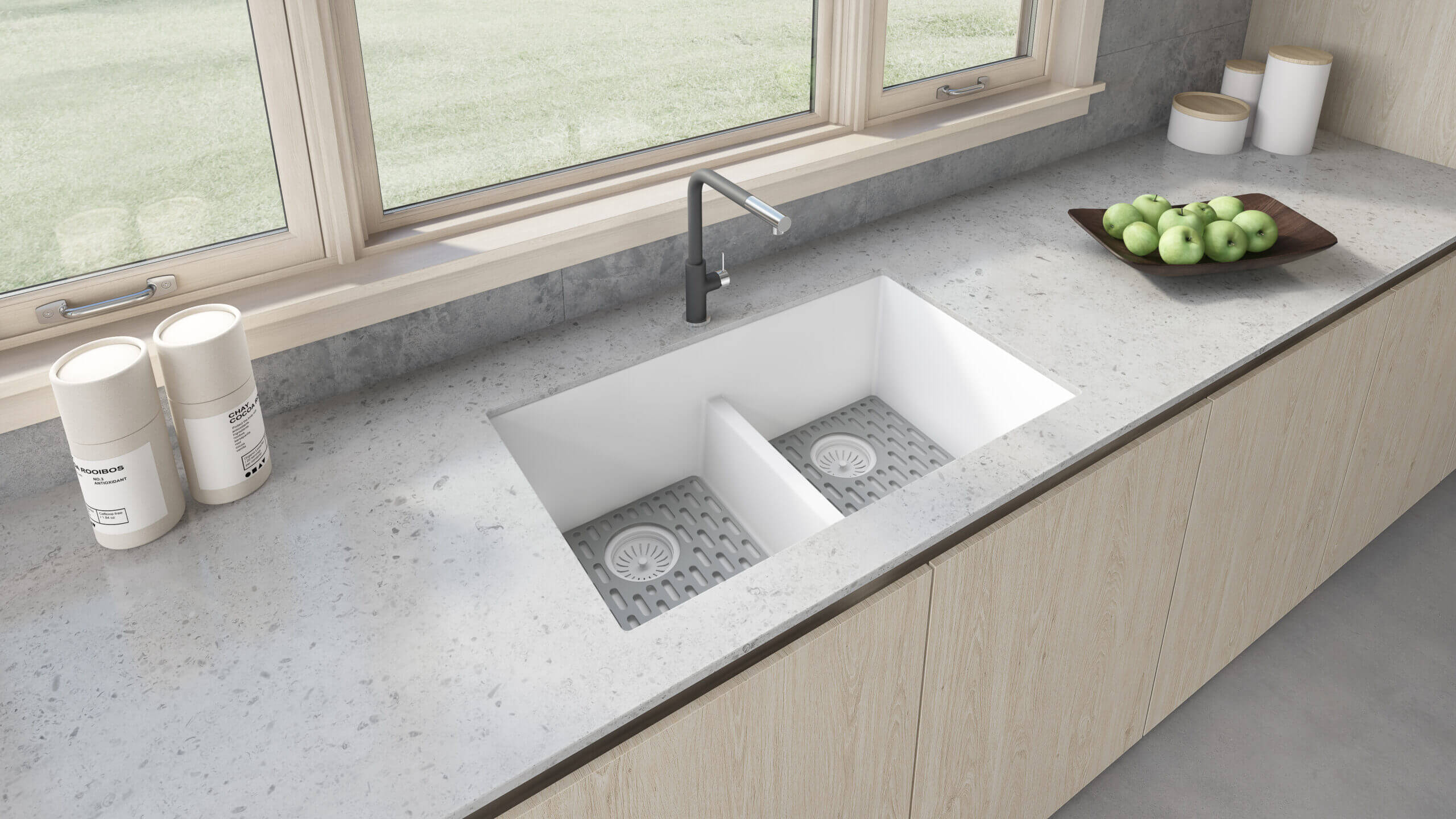 - Sleek and Modern Appearance: Low divide sinks blend the practicality of a double bowl sink with the visual appeal of a single basin, creating a contemporary focal point in your kitchen. Ruvati offers collections in stainless steel or granite that are sure to suit even the choosiest kitchen connoisseur.