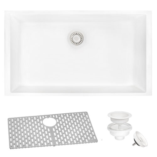 To complement the sink, the epiGranite collection also includes a matching white strainer drain assembly, an epitome of functional elegance. This assembly seamlessly fits into a standard 3.5" drain opening, providing easy waste disposal. The exterior dimensions and interior bowl dimensions are carefully calculated, ensuring ample space while maintaining a sleek and streamlined appearance.