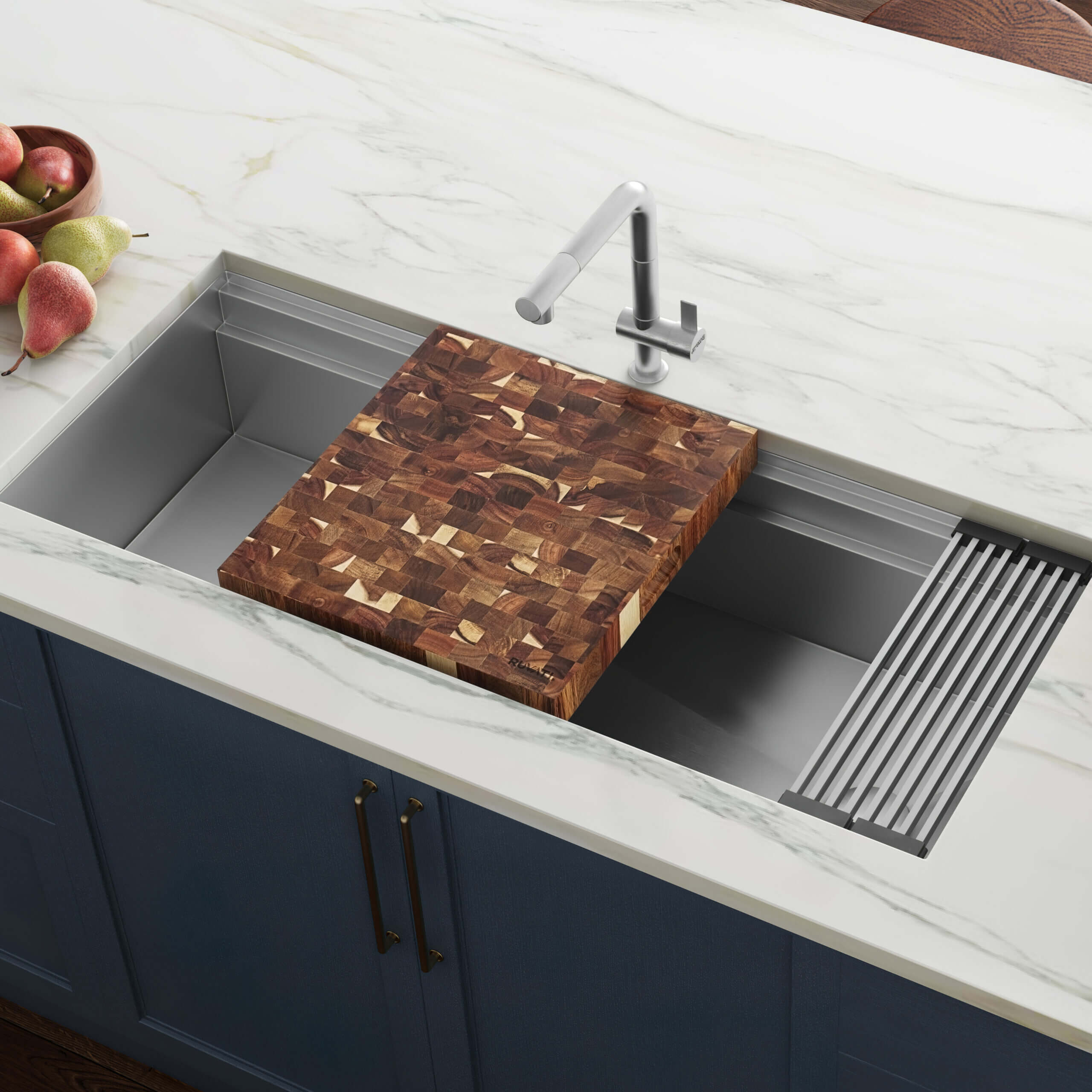 This 2-inch thick END-GRAIN solid hardwood butcher block from Ruvati is the ultimate companion for your culinary experience. Sized to fit perfectly and slide on the built-in ledges of your Ruvati workstation sinks. In dual-tier workstation sinks, it fits on both the upper and lower tiers. End-grain means the board is made of short pieces of wood standing on their end (vertically instead of sideways). This gives a beautiful checkered finish, and a cutting surface that is strong and durable. The surface is made of the fibrous ends of the wood, and with every blow the knife slide between the wood fibers. This helps keep your knives sharper and makes your chopping a pleasure. You can use this butcher block by itself on top of your counter, or if you have Ruvati workstation sink, it sits and slides conveniently on top of your sink.