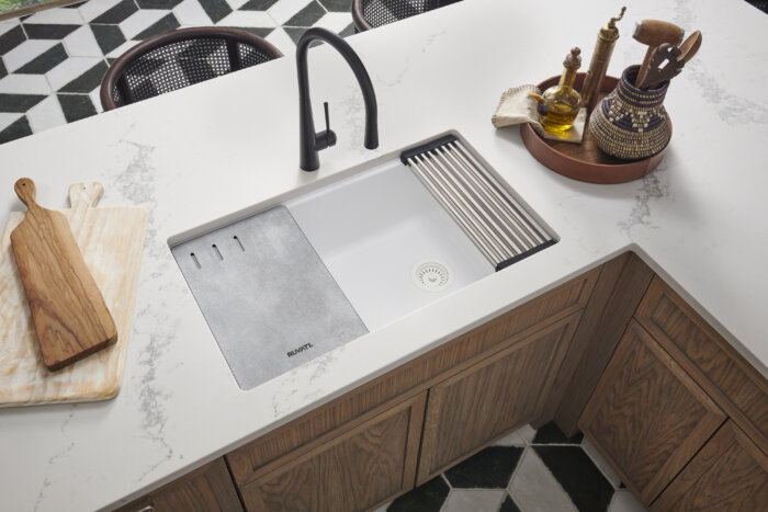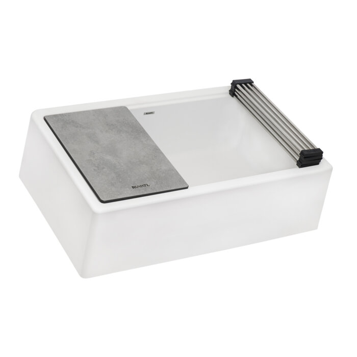 This solid compositie cutting board features a textured concrete finish and fits Ruvati stainless steel workstation sinks. You can get it as a replacement or as an extra cutting board for your daily needs.
