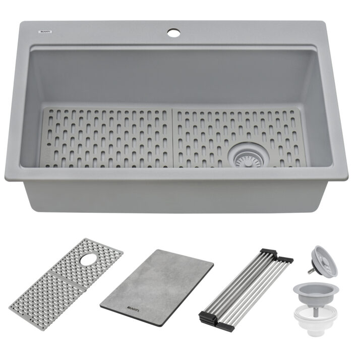 - INCLUDED IN BOX: sink, solid composite cutting board, stainless steel foldable drying rack, silicone bottom rinse grid, matching color basket strainer drain assembly, installation guide.