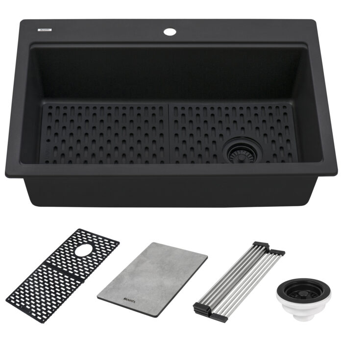- INCLUDED IN BOX: sink, solid composite cutting board, stainless steel foldable drying rack, silicone bottom rinse grid, matching color basket strainer drain assembly, installation guide.