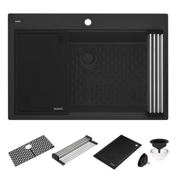 - INCLUDED IN BOX: sink, black composite cutting board, stainless steel foldable drying rack, silicone bottom rinse grid, matching color basket strainer drain assembly, installation guide.