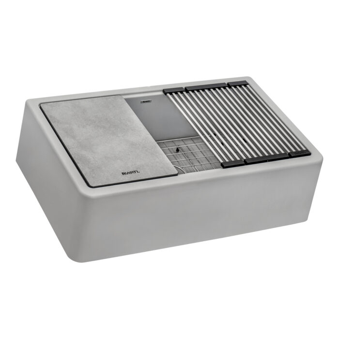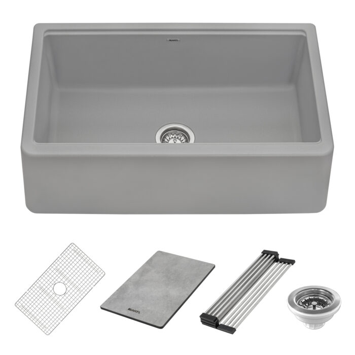 - INCLUDED IN BOX: Sink, solid composite cutting board, stainless steel foldable drying rack, stainless steel bottom rinse grid, matching color basket strainer drain assembly, installation guide.