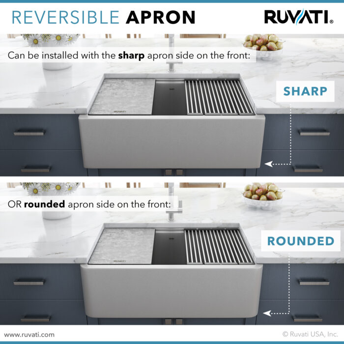 - UNIQUE REVERSIBLE DESIGN: Can be installed depending on your style preference – one side of the sink has a rounded corner apron-front suitable for traditional decors and the other with a sharp corner for a more contemporary look.