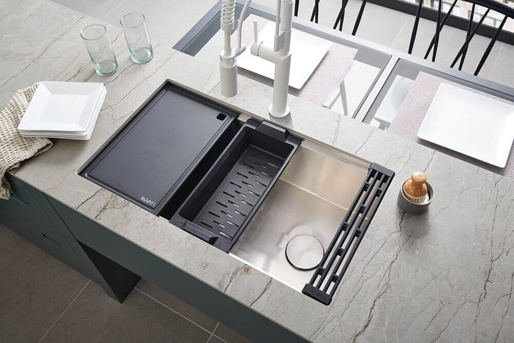 With black composite accessories, Ruvati's Veniso Nova collection transform the traditional workstation sink