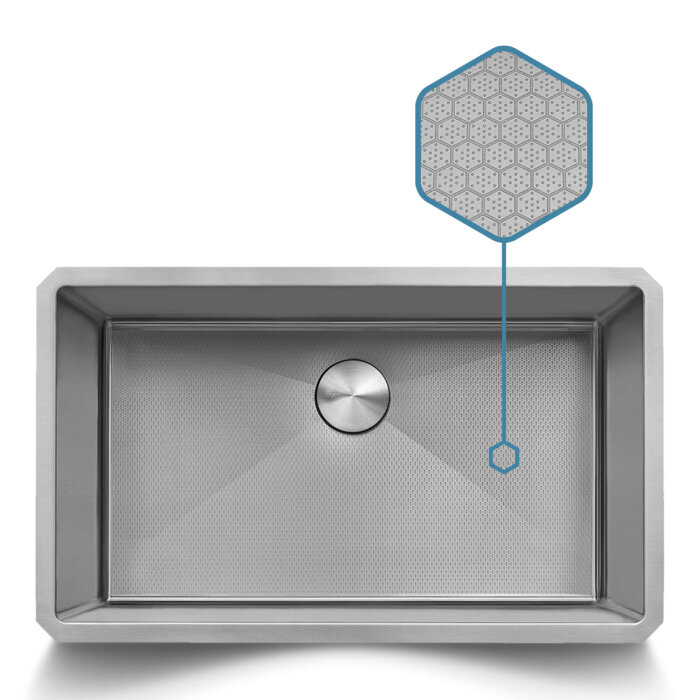 Our Hex Bottom sinks are ideal for customer who would rather not use a bottom rinse grid in their sink. The bottom of our Hex bottom sinks are embossed with a hexagonal pattern and matte finish for a semi reflective look. This textured bottom minimizes contact points and protects the sink from scratches and everyday wear and tear.