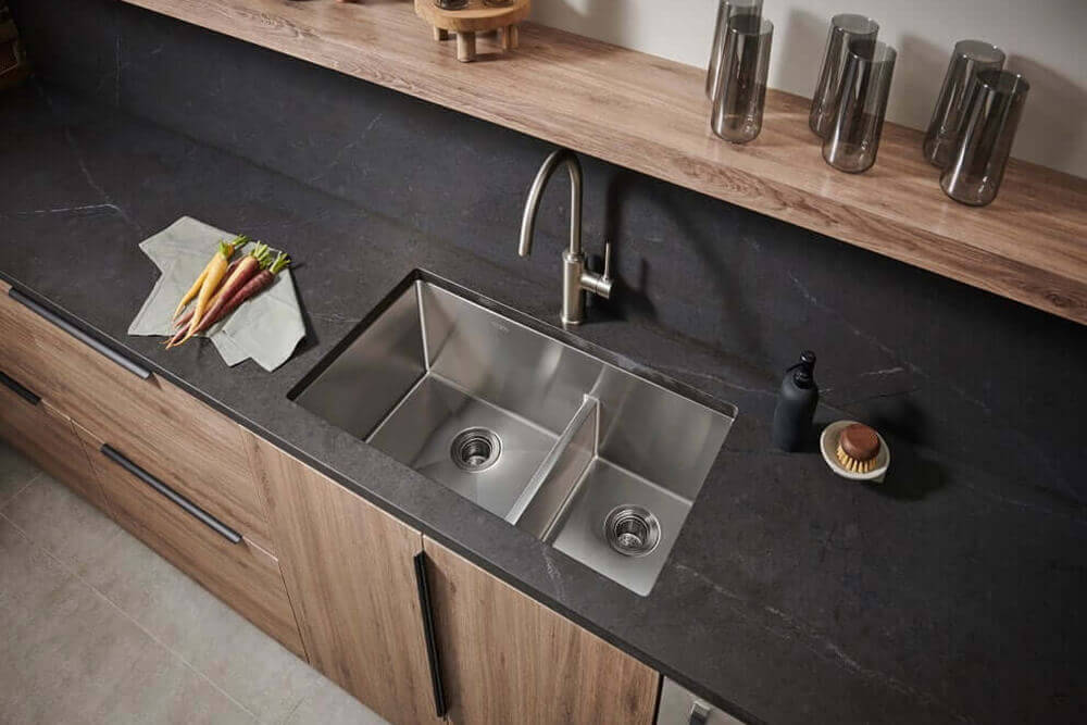 An innovation in double bowl design, the Urbana collection features a unique low divide. With a low middle divider, you have more space to wash large pots and pans with ease.