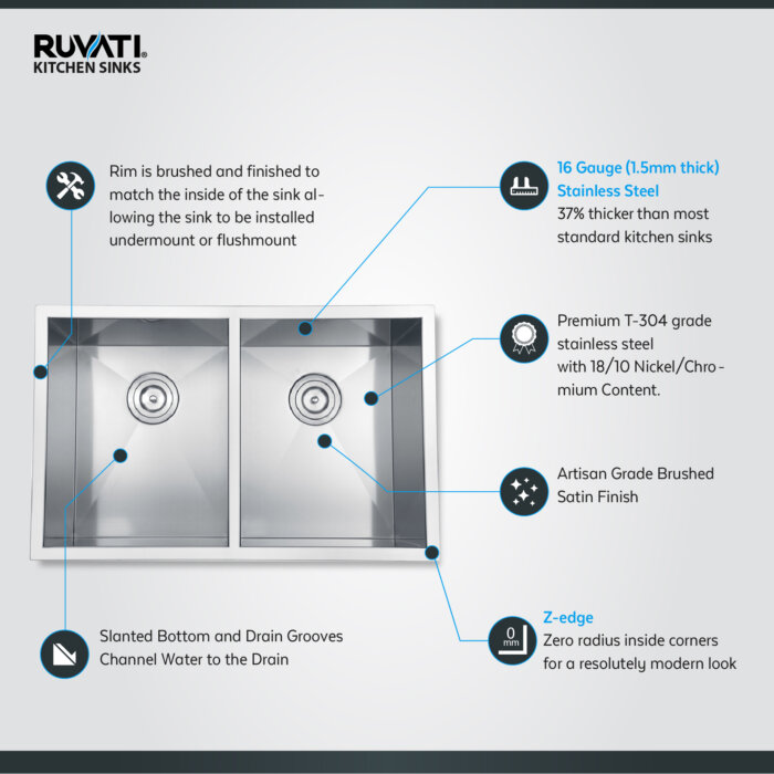 Experience the beauty of tradition with the Nesta collection from Ruvati. Sure to please any designer with an eye for purism, this collection is defined by square bowls, sharp corners, and undermount installation. Rear drain placement and elegant drain grooves add to the functionality of the sink. Made of premium, commercial-grade 16-gauge stainless steel, each sink is extremely durable and easy to clean. The included stainless steel rinse grid protects the bottom of the sink and allows for water to flow freely. Maintaining a classic look that will complement any kitchen, the Nesta collection provides an excellent centerpiece for your countertop.