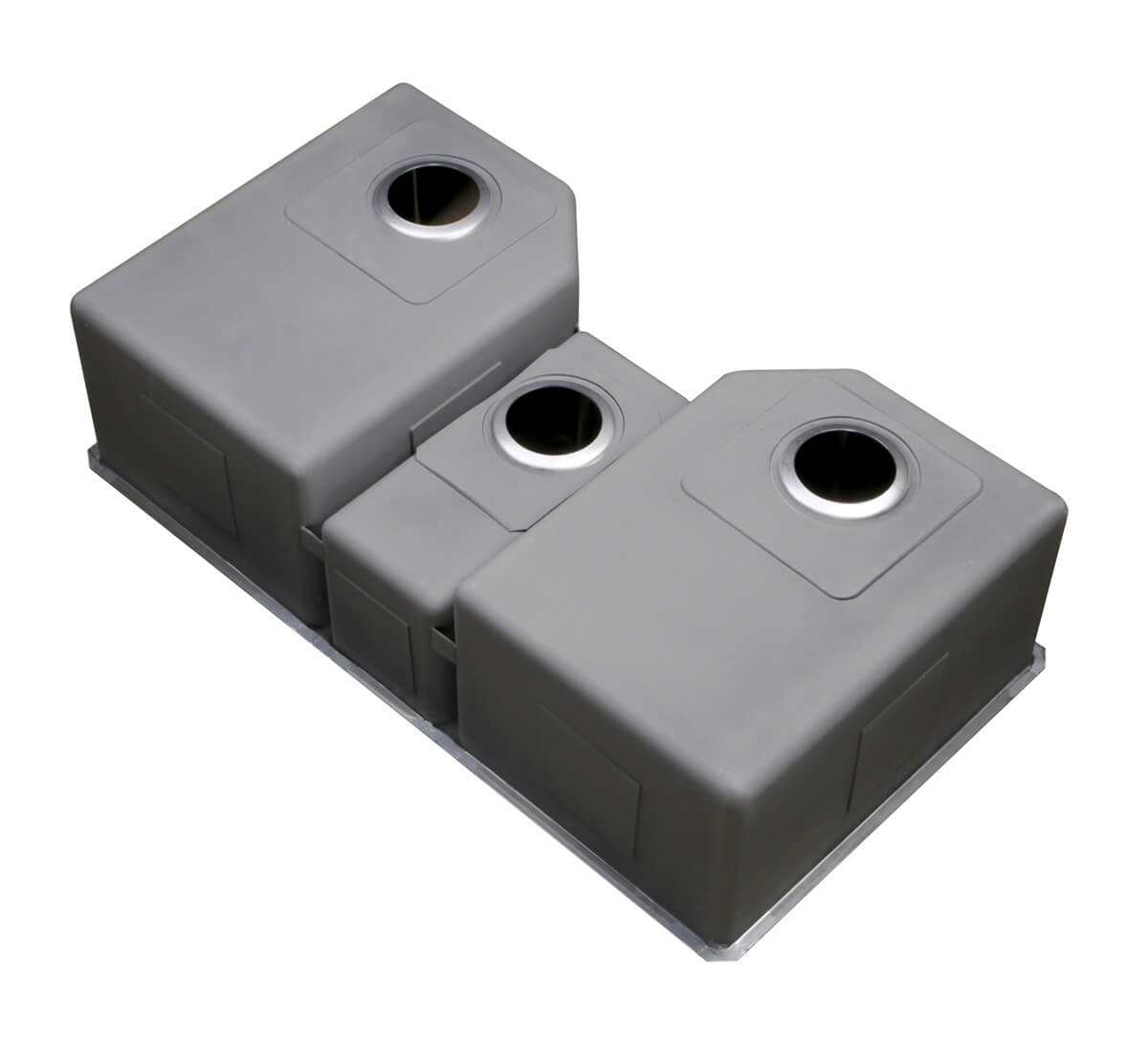 The Gravena collection offers a modern, linear design with large, rectangular bowls. In addition, 16 gauge stainless steel and curved corners allow for durability, easy cleaning, and a resolutely modern look.