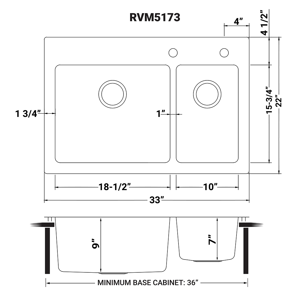 - INTERIOR BOWL DIMENSIONS: 18-1/2″ x 15-3/4″ (left) x 10″ x 15-3/4″ (right)